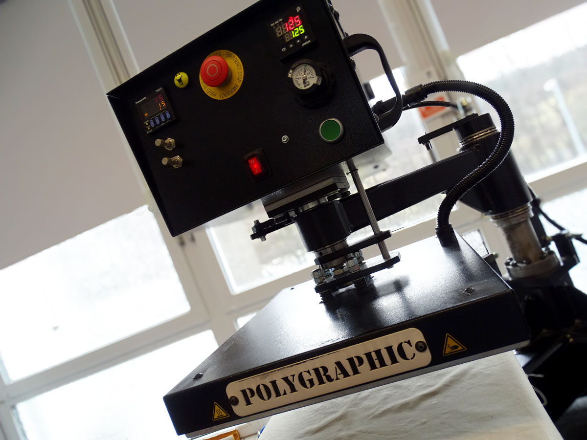 Anschließend wird das Motiv mittels Hitze in einem speziellen Ofen getrocknet. Nach dem Abkühlen kann die Folie auf die gewünschte Stelle auf das Textil gelegt werden und mit einer Heißpresse übertragen werden.